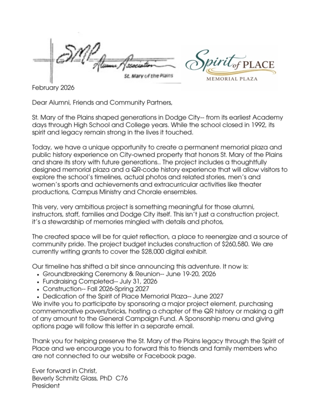 The Alumni Association depends entirely upon your donations. Please consider a $20 annual membership remittance to help support this site. This site will be our main means of correspondence with all SMOP alumni from July 2009. We have committed to a 10 year contract to maintain this site. Your donation will help to assure we will continue to bring you all the current information regarding St. Mary's and 6,000 of your alumni brothers and sisters. Our address is St, Mary of the Plains Alumni Office, P.O. Box 416, Dodge City, Kansas. 67801 Thank You!